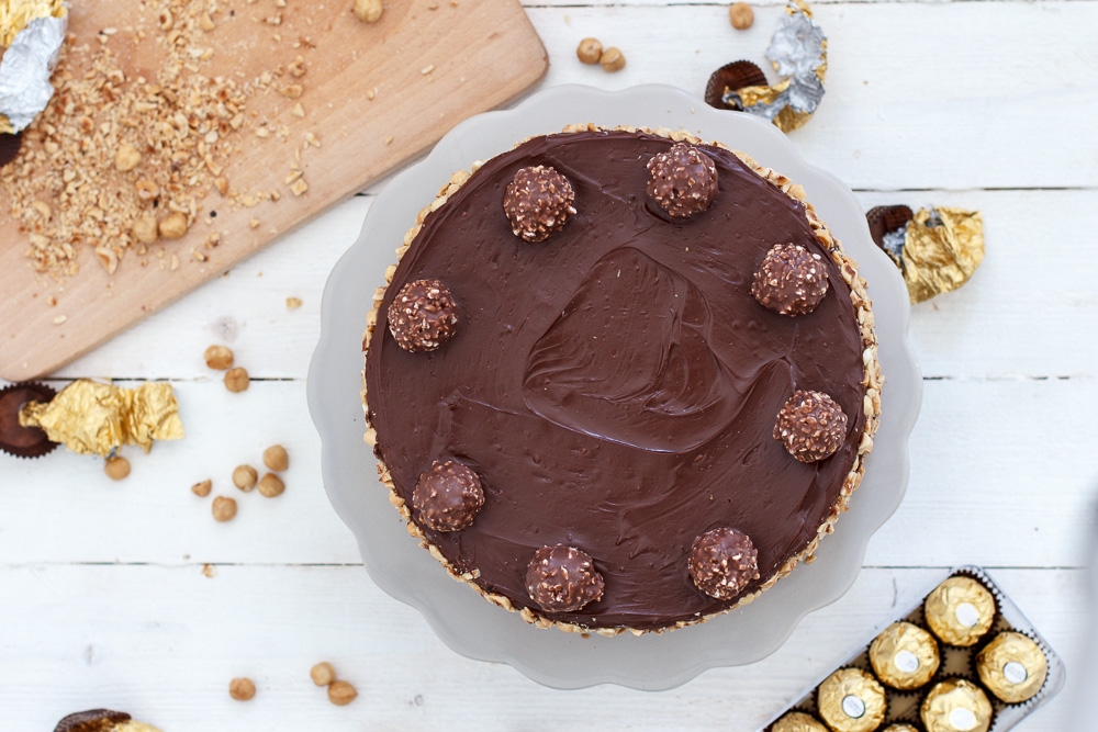 Zoals je ziet is de taart opgebouwd uit drie lagen cake, met daartussen en omheen een chocolade hazelnootcrème en stukjes gehakte hazelnootjes. Just like a Ferrero Rocher! Eigenlijk zit er in een Ferrero Rocher ook nog een wafel element, maar deze heb ik weggelaten omdat dit snel taai zal worden.