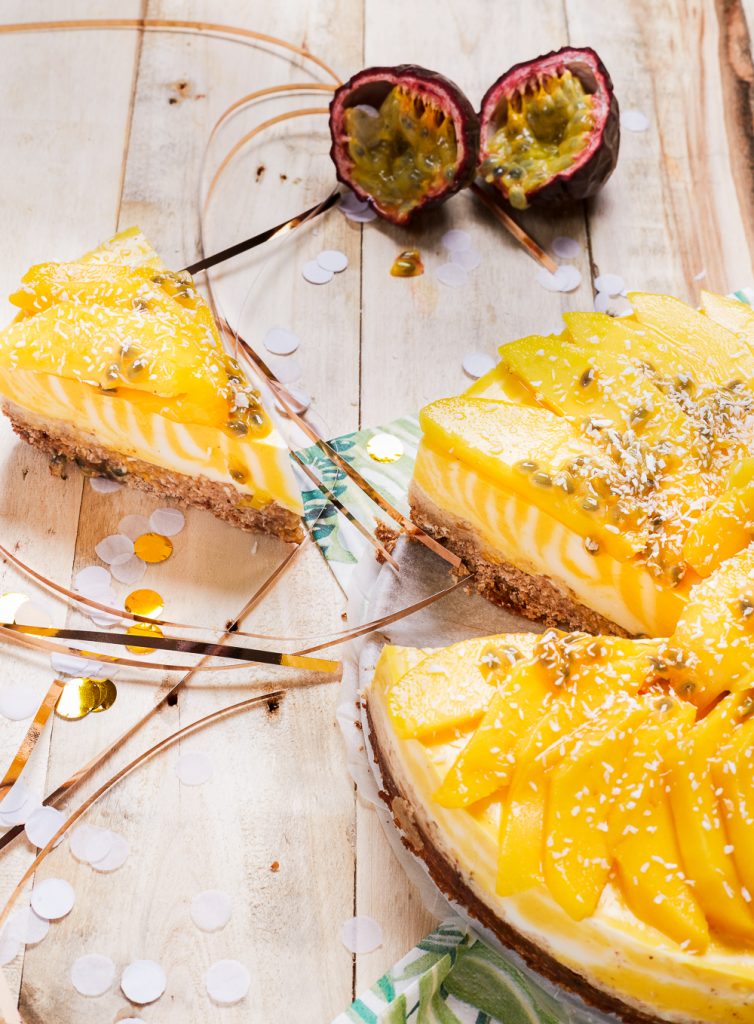 - TOPPING. Als de cheesecake voldoende is opgesteven kun je aan de slag met de topping. Snijd de mango verticaal van de pit af, en snijd hem in reepjes. Besprenkel ze met het citroensap. Zodra de vulling stijf genoeg is, kun je de stukjes mango als een waaier uitspreiden over de taart. Top de taart af met de inhoud van de passievruchten en serveer!