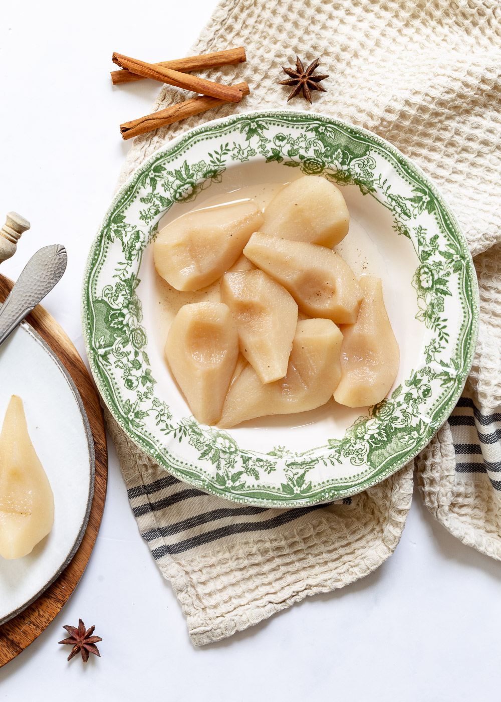 - Schil de stoofperen, snijd in kwarten en verwijder het klokhuis en het steeltje.